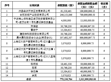 公告顯示,本次發(fā)行對(duì)象最終確定為 14 家,最終確定本次非公開(kāi)發(fā)行的發(fā)行對(duì)象與獲配數(shù)量如下: