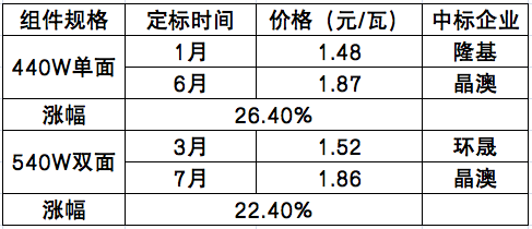 在價格方面,2021年上半年隨著組價集采的推進,組件價格受硅料上漲影響,其報價也呈現(xiàn)快速上漲的趨勢。從年初中核集團第一批1.3GW組件集采,隆基單面450組件報出1.48/瓦元的中標價格,到今年6月蒙能包頭50MW技術領跑項目中晶澳以450單面1.87元/瓦的中標價格拿下上半年“標王”,組件漲幅約26%左右。相較于去年1.55元/瓦的定標均價而言,今年440+組件已經(jīng)來到1.7元/瓦上下;540雙面則由3月廣東電力第一批組件集采的1.52元/瓦的中標價上漲至7月廣東電力第三批組件集采的1.86元/瓦中標價格,漲幅約22.37%。