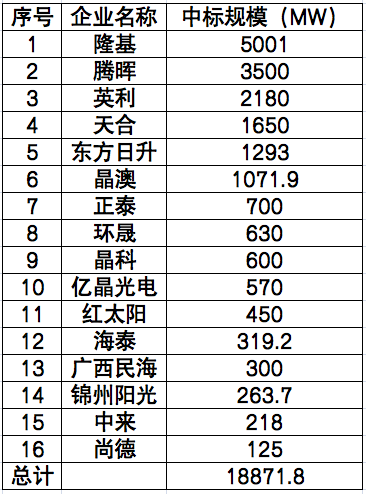 從定標情況來看,由于部分央企采取的是框架招標,實際中標人并未明確,在剔除此類招標逾10GW后,明確中標人的定標規(guī)模約為19GW。其中,中標規(guī)模TOP5依次為隆基、騰暉、英利、天合、東方日升;在一二線組件企業(yè)占比中,TOP6組件企業(yè)中標規(guī)模總計為9.616GW,占明確中標人總規(guī)模比重為51%。