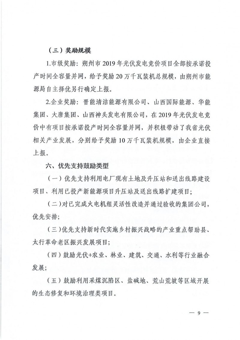 值得注意的是,為了鼓勵(lì)光伏建設(shè),山西省進(jìn)行了市級(jí)獎(jiǎng)勵(lì)和企業(yè)獎(jiǎng)勵(lì)。其中,朔州市2019年光伏發(fā)電競(jìng)價(jià)項(xiàng)目全部按承諾投產(chǎn)時(shí)間全容量并網(wǎng),給予獎(jiǎng)勵(lì)20萬千瓦裝機(jī)總規(guī)模,由朔州市能源局自主擇優(yōu)另行確定上報(bào)。