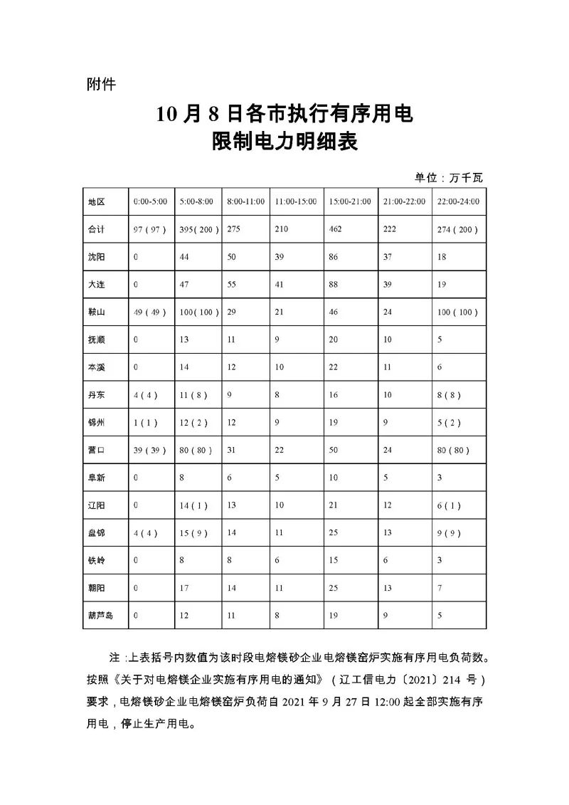 根據(jù)電力供需平衡預(yù)測(cè),10月8日遼寧省最大電力缺口為462萬千瓦,依據(jù)國家發(fā)改委《有序用電管理辦法》,為嚴(yán)重缺電II級(jí)橙色預(yù)警。決定10月8日0:00-5:00限制電力97萬千瓦,5:00-8:00限制電力395萬千瓦,8:00-11:00限制電力275萬千瓦,11:00-15:00限制電力210萬千瓦,15:00-21:00限制電力462萬千瓦,21:00-22:00限制電力222萬千瓦,22:00-24:00限制電力274萬千瓦。