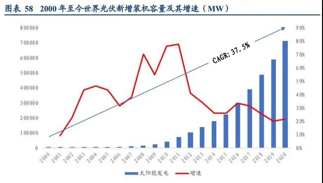 2014 年之后,光伏發(fā)電行業(yè)經(jīng)過優(yōu)勝劣汰的篩選,發(fā)電成本持續(xù)大幅下降,投資回報重 新獲得平衡,全球更多的國家加入到支持光伏發(fā)電的行列,具有技術(shù)研發(fā)優(yōu)勢、規(guī)模優(yōu)勢的企業(yè)涌現(xiàn)??v觀歷史,近20年間光伏增速年均復(fù)合增長率達(dá) 37.5%。
