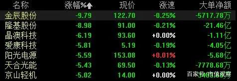 盤(pán)面顯示,金辰股份(603396)一度大跌10%,尾盤(pán)小幅拉升收跌9.79%,一日蒸發(fā)15.4億元。此外,陽(yáng)光電源(300274)等6只概念股跌超5%。
