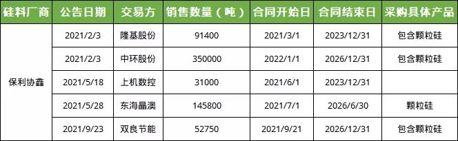 保利協(xié)鑫與下游客戶陸續(xù)簽訂采購長單:保利協(xié)鑫與隆基、中環(huán)、上機(jī)、晶澳、雙良等下游客戶簽訂硅料采購長單,總供應(yīng)量68.46萬噸,年均供應(yīng)量22.82萬噸;其中,隆基、中環(huán)、雙良采購產(chǎn)品中明確包含顆粒硅產(chǎn)品,晶澳將于未來5年向協(xié)鑫采購總計14.58萬噸顆粒硅;而上機(jī)則將與保利協(xié)鑫共建30萬噸顆粒硅產(chǎn)能。下游客戶長單采購表明了顆粒硅進(jìn)一步獲得認(rèn)可。