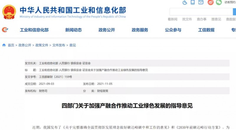 近期,我國發(fā)布了《關(guān)于完整準(zhǔn)確全面貫徹新發(fā)展理念做好碳達(dá)峰碳中和工作的意見》和《2030年前碳達(dá)峰行動方案》。為貫徹落實(shí)習(xí)近平總書記關(guān)于金融服務(wù)實(shí)體經(jīng)濟(jì)系列重要指示精神和黨中央、國務(wù)院關(guān)于碳達(dá)峰、碳中和重大決策部署,工業(yè)和信息化部、人民銀行、銀保監(jiān)會、證監(jiān)會聯(lián)合發(fā)布《關(guān)于加強(qiáng)產(chǎn)融合作推動工業(yè)綠色發(fā)展的指導(dǎo)意見》(工信部聯(lián)財(cái)〔2021〕159號),建立商業(yè)可持續(xù)的產(chǎn)融合作推動工業(yè)綠色發(fā)展路徑,推動建設(shè)工業(yè)綠色低碳轉(zhuǎn)型與工業(yè)賦能綠色發(fā)展相互促進(jìn)、深度融合的產(chǎn)業(yè)體系,以工業(yè)綠色化引領(lǐng)高端化、智能化發(fā)展,促進(jìn)工業(yè)穩(wěn)增長和有效投資,助力制造強(qiáng)國和網(wǎng)絡(luò)強(qiáng)國建設(shè),推動經(jīng)濟(jì)社會綠色發(fā)展,為應(yīng)對全球氣候變化貢獻(xiàn)力量。