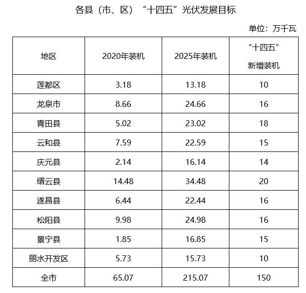 全面貫徹黨的十九大和十九屆二中、三中、四中、五中全會精神,認真落實國家和省碳達峰碳中和工作部署,牢牢把握生態(tài)文明建設(shè)要求,加強統(tǒng)籌協(xié)調(diào),創(chuàng)新發(fā)展模式,加快調(diào)整優(yōu)化能源結(jié)構(gòu),以分布式光伏整縣(市、區(qū))規(guī)?;_發(fā)為抓手,全面實施“光伏+”工程,推動綠色低碳能源產(chǎn)業(yè)高質(zhì)量發(fā)展,著力打造華東綠色能源基地。力爭“十四五”全市新增光伏發(fā)電150萬千瓦,其中市區(qū)(含蓮都區(qū)、麗水經(jīng)濟開發(fā)區(qū))新增光伏發(fā)電20萬千瓦。