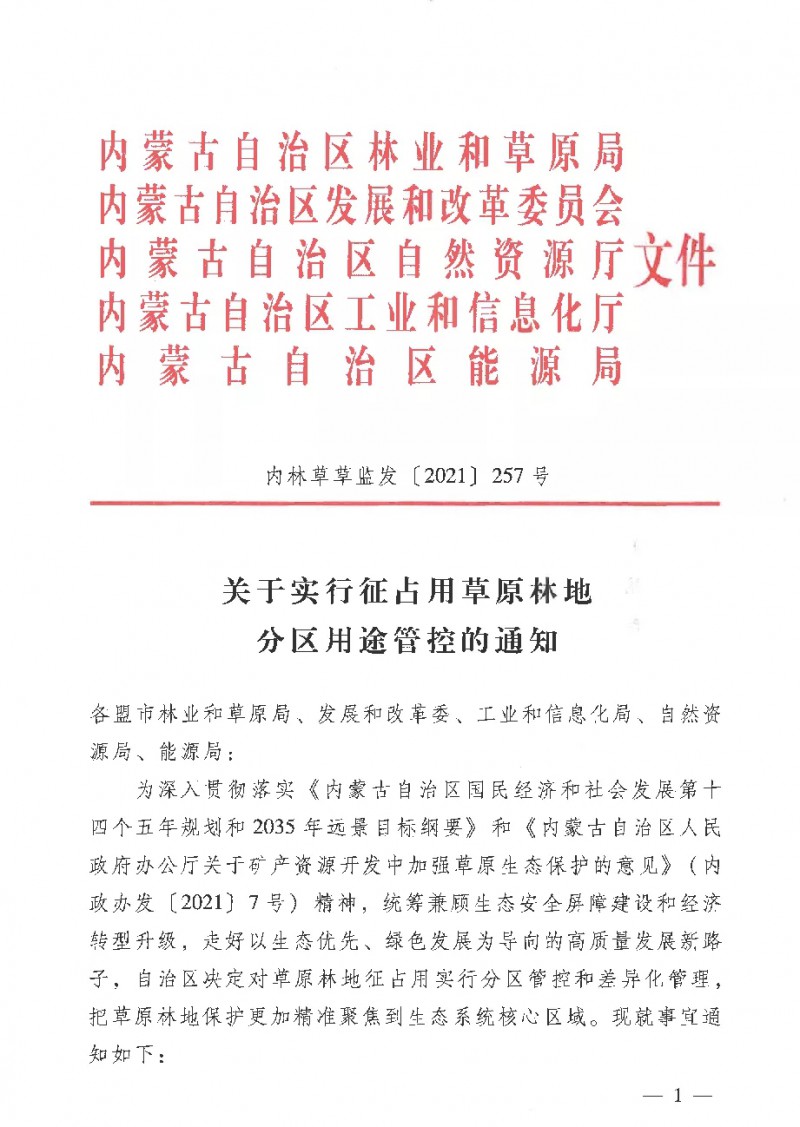 近日,內(nèi)蒙古自治區(qū)林業(yè)和草原局,內(nèi)蒙古自治區(qū)發(fā)展和改革委員會(huì),內(nèi)蒙古自治區(qū)自然資源廳,內(nèi)蒙古自治區(qū)工業(yè)和信息化廳,內(nèi)蒙古自治區(qū)能源局聯(lián)合發(fā)布了《關(guān)于實(shí)行征占用草原林地分區(qū)用途管控的通知》,把草原林地保護(hù)更加精準(zhǔn)聚焦到生態(tài)系統(tǒng)核心區(qū)域。文件顯示,內(nèi)蒙古將實(shí)行征占用草原林地分區(qū)用途管控。