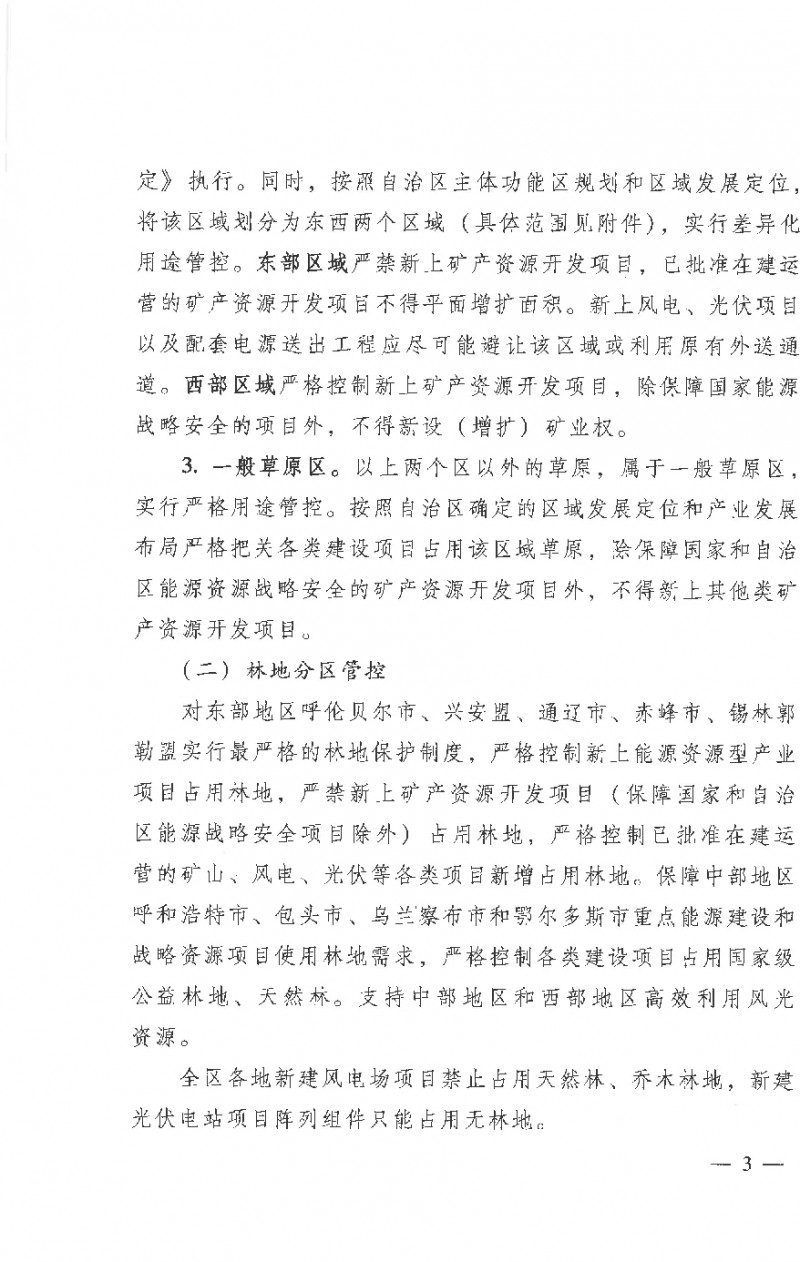對(duì)東部地區(qū)呼倫貝爾市、興安盟、通遼市、赤峰市、錫林郭勒盟實(shí)行最嚴(yán)格的林地保護(hù)制度,嚴(yán)格控制新上能源資源型產(chǎn)業(yè)項(xiàng)目占用林地,嚴(yán)禁新上礦產(chǎn)資源開(kāi)發(fā)項(xiàng)目(保障國(guó)家和自治區(qū)能源戰(zhàn)略安全項(xiàng)目除外)占用林地,嚴(yán)格控制已批準(zhǔn)在建運(yùn)營(yíng)的礦山、風(fēng)電、光伏等各類項(xiàng)目新增占用林地。