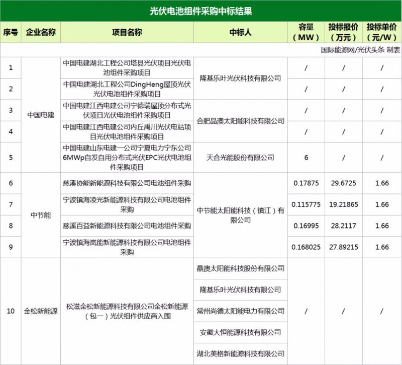 近日,中國電建、中節(jié)能、金松新能源發(fā)布光伏電池組件、光伏逆變器、光伏支架等項目中標(biāo)結(jié)果公告。規(guī)模合計為212.6325MW。