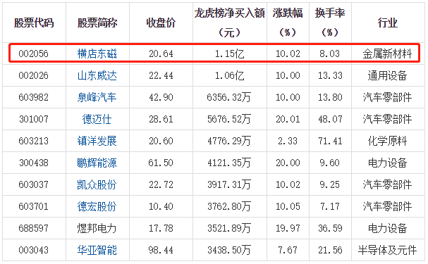 橫店東磁入選龍虎榜,當日凈買入額達到1.15億