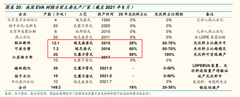 縱觀所有具備EVA產(chǎn)能的國(guó)內(nèi)企業(yè),能夠生產(chǎn)光伏級(jí)EVA的也只有斯?fàn)柊?、?lián)泓新科和寧波臺(tái)塑三家。榆林能化、揚(yáng)子石化、中化泉州石化均在2021年5-7月投產(chǎn)EVA材料,但暫未具備生產(chǎn)光伏級(jí)EVA的能力。