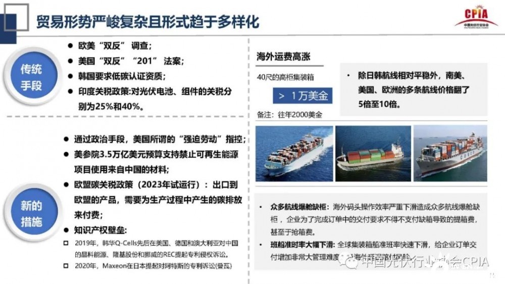 在海外市場(chǎng)中,由于中國(guó)六成以上的產(chǎn)品需要出口,而海外市場(chǎng)中貿(mào)易形式嚴(yán)峻復(fù)雜且形式趨于多樣化。如歐美“雙反”調(diào)查、美國(guó)“雙反”“201”法案等。同時(shí)海外運(yùn)費(fèi)高漲,除日韓航線相對(duì)平穩(wěn)外,南美、美國(guó)、歐洲的多條航線價(jià)格翻了5倍至10倍。