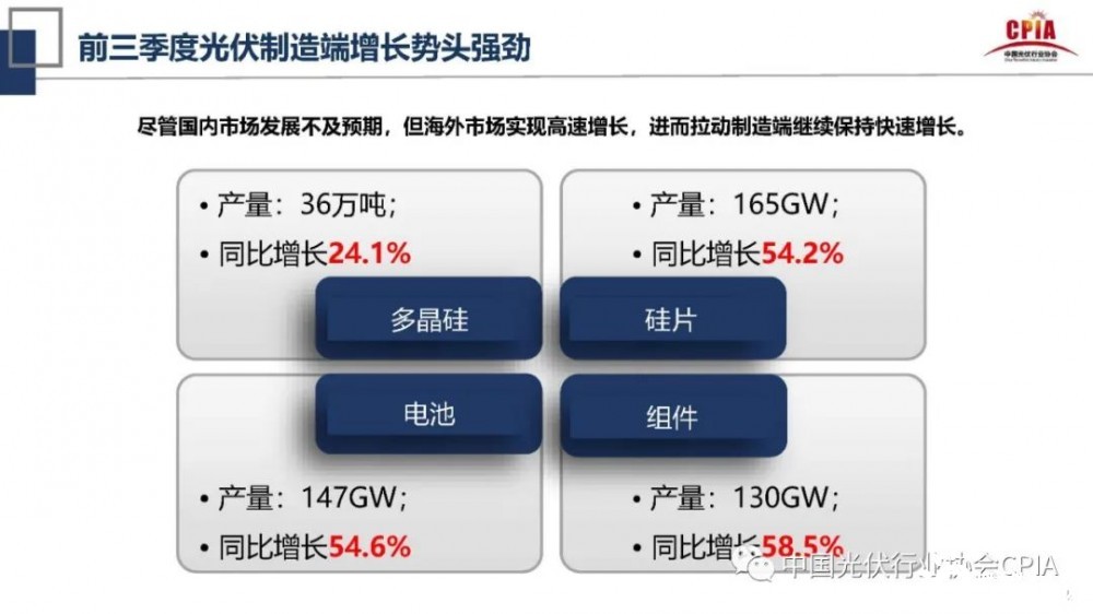 在此次會(huì)議上,王勃華對(duì)光伏行業(yè)的發(fā)展情況做了詳細(xì)介紹。在光伏制造端方面,他指出,2021年前三季度光伏制造端增長(zhǎng)勢(shì)頭強(qiáng)勁,在光伏制造端四個(gè)環(huán)節(jié)中,多晶硅產(chǎn)量為36萬(wàn)噸,同比增長(zhǎng)24.1%;硅片產(chǎn)量為165GW,同比增長(zhǎng)54.2%;電池產(chǎn)量為147GW,同比增長(zhǎng)54.6%;組件產(chǎn)量為130GW,同比增長(zhǎng)58.5%。他表示,盡管國(guó)內(nèi)市場(chǎng)發(fā)展不及預(yù)期,但海外市場(chǎng)實(shí)現(xiàn)了高速增長(zhǎng),進(jìn)而拉動(dòng)光伏制造端繼續(xù)保持快速增長(zhǎng)。因此,光伏制造端在今年仍處于快速發(fā)展中。