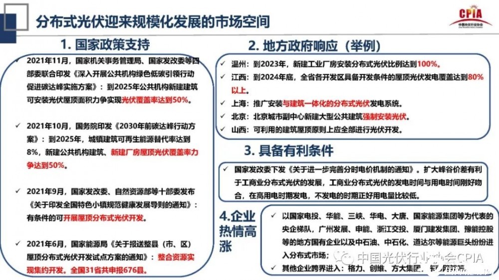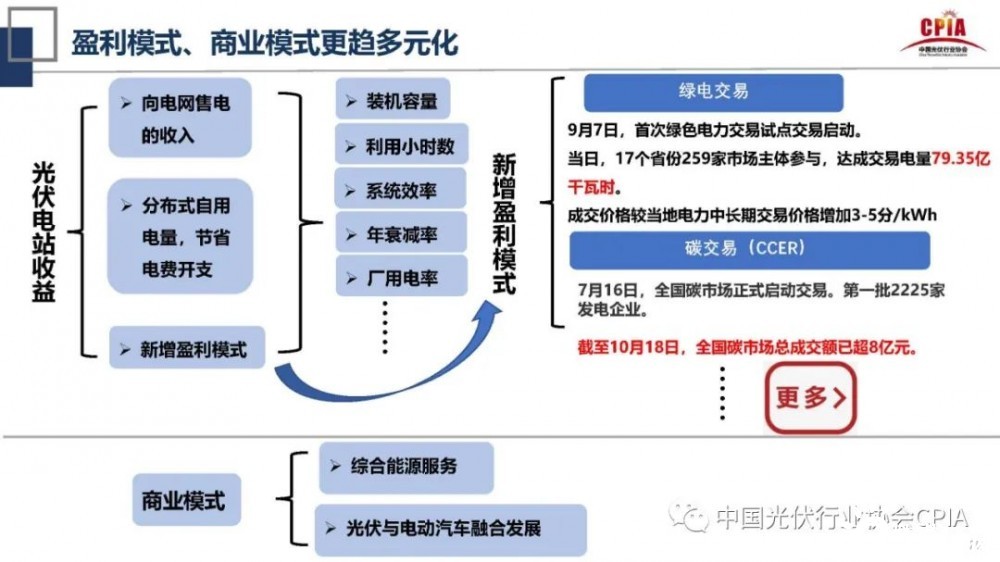 王勃華還指出,未來(lái)分布式光伏將迎來(lái)規(guī)?;l(fā)展的市場(chǎng)空間。究其原因是,第一,國(guó)家、地方政策的支持,以央企為梯隊(duì),地方國(guó)有企業(yè)和跨界能源巨頭企業(yè)為代表紛紛進(jìn)入分布式市場(chǎng)。第二,光伏盈利模式、商業(yè)模式的多元化。盈利上光伏電站收益新增綠電交易和碳交易(CCER)等盈利模式,商業(yè)模式方面是綜合能源服務(wù)和光伏與電動(dòng)汽車融合發(fā)展。