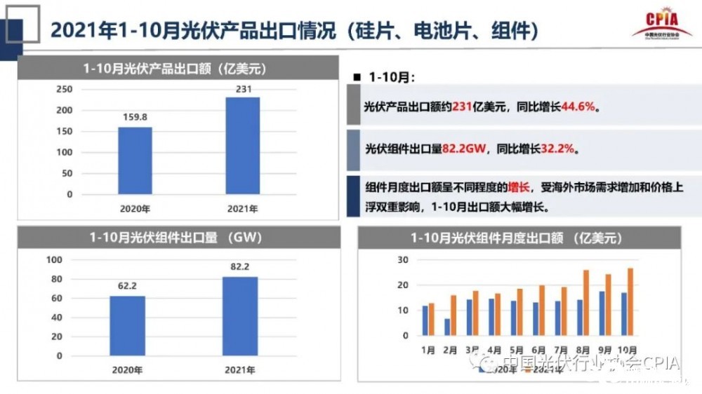 對(duì)其增長(zhǎng)的原因,王勃華分析稱:“其一是組件月度出口額量不同程度的增長(zhǎng),1-10月光伏組件出口量為82.2GW,同比增長(zhǎng)了32.2%,根據(jù)往年數(shù)據(jù)對(duì)比,組件每月出口數(shù)據(jù)都有超過(guò)去年。其二是受海外市場(chǎng)需求增加和價(jià)格上浮雙重影響,1-10月光伏產(chǎn)品出口額呈現(xiàn)大幅增長(zhǎng)趨勢(shì)。”