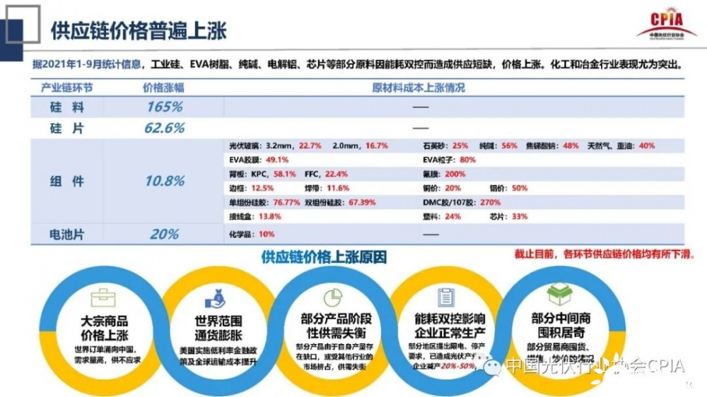 在國(guó)內(nèi)市場(chǎng)中,中國(guó)面臨供應(yīng)鏈價(jià)格普遍上漲給行業(yè)發(fā)展所帶來(lái)的風(fēng)險(xiǎn)。據(jù)2021年1-9月統(tǒng)計(jì)信息,工業(yè)硅、EVA樹脂、純堿、電解鋁、芯片等部分原料因能耗雙控而造成供應(yīng)短缺,價(jià)格上漲,化工和冶金行業(yè)表現(xiàn)尤為突出。
