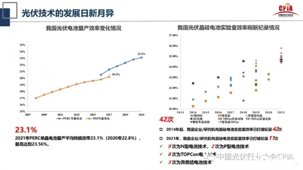 在光伏技術(shù)方面,王勃華形容其為“日新月異”。特別在轉(zhuǎn)換效率方面,2021年我國(guó)PERC單晶電池量平均轉(zhuǎn)換效率達(dá)23.1%,最高達(dá)到23.56%。而2020年僅有22.8%。在光伏晶硅電池實(shí)驗(yàn)室效率方面,從2014年起至今8年時(shí)間,我國(guó)企業(yè)/研究機(jī)構(gòu)晶硅電池實(shí)驗(yàn)室效率已打破紀(jì)錄42次,2021年,我國(guó)企業(yè)/研究機(jī)構(gòu)晶硅電池實(shí)驗(yàn)室效率已打破紀(jì)錄11次。其中,9次為N型電池技術(shù),2次為P型電池技術(shù),8次為TOPCon電池技術(shù),3次為異質(zhì)結(jié)電池技術(shù)。