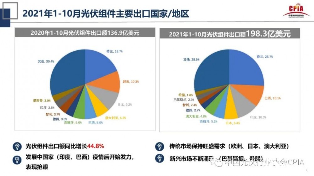 緊接著,王勃華對(duì)2020年和2021年光伏組件主要出口國(guó)家/地區(qū)做了介紹。2021年1-10月光伏組件出口額為198.3億美元,其中,歐洲、日本、澳大利亞等傳統(tǒng)市場(chǎng)國(guó)家保持旺盛需求,巴基斯坦、希臘等新興市場(chǎng)也不斷涌現(xiàn)出來(lái)。對(duì)比2020年,2020年1-10月光伏組件出口額為136.9億美元,同比增長(zhǎng)44.8%,其中,印度、巴西等發(fā)展中國(guó)家在疫情后開始發(fā)力,表現(xiàn)十分搶眼。