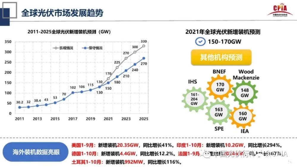 根據(jù)國(guó)際著名的研究機(jī)構(gòu)預(yù)測(cè),到2050年可再生能源發(fā)電量占比提升到90%,其中光伏和風(fēng)電占比63%,全球光伏裝機(jī)將超過(guò)14000GW。而在比較樂觀的情形下,2021-2026年光伏新增裝機(jī)將從160GW增到260GW,6年間光伏累計(jì)新增裝機(jī)量占可再生能源累計(jì)新增裝機(jī)量的60%。2021年全球光伏新增裝機(jī)預(yù)測(cè)達(dá)150-170GW。