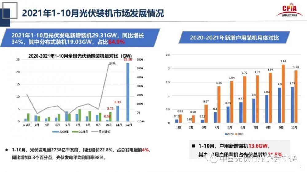 在光伏市場(chǎng)方面,2021年1-10月光伏發(fā)電新增裝機(jī)29.31GW,同比增長(zhǎng)34%,其中分布式裝機(jī)19.03GW,占比達(dá)64.9%;1-10月,光伏發(fā)電量2738億千瓦時(shí),同比增長(zhǎng)22.8%,占總發(fā)電量的4%,同比增加了0.3個(gè)百分點(diǎn),光伏發(fā)電平均利用率為98%;1-10月,戶用新增裝機(jī)為13.6GW,其中10月戶用裝機(jī)占光伏總裝機(jī)51.5%。