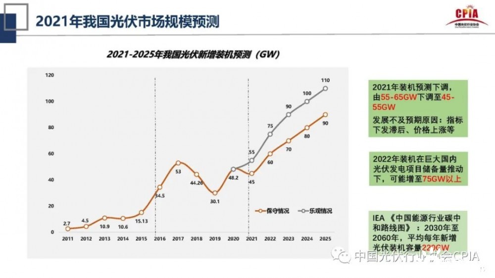 據(jù)此,王勃華表示,供應(yīng)鏈價(jià)格的上漲尤其會(huì)影響到光伏裝機(jī)的預(yù)測(cè)。他說(shuō):“今年光伏裝機(jī)量預(yù)測(cè)要下調(diào),由原來(lái)的55-65GW下調(diào)至45-55GW,發(fā)展不及預(yù)期的原因?yàn)橹笜?biāo)下發(fā)滯后、價(jià)格上漲等所致。但是2022年光伏裝機(jī)在國(guó)內(nèi)巨大的光伏發(fā)電項(xiàng)目?jī)?chǔ)備量推動(dòng)下,可能會(huì)增至75GW以上。”