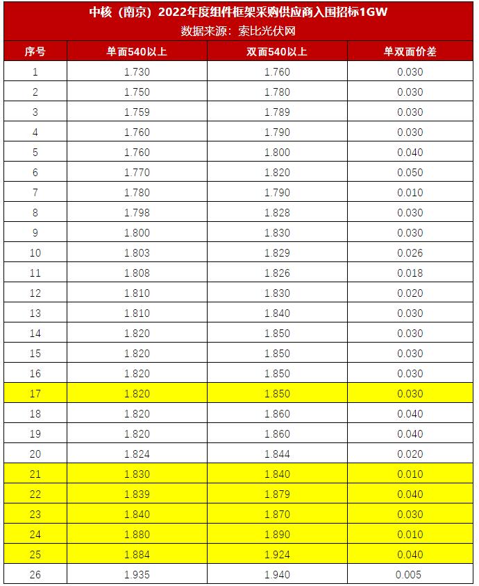 1月19日,中核(南京)2022年度1GW光伏組件框架采購供應商入圍招標正式開標。索比光伏網獲悉,本次共26家企業(yè)提供報價,單面組件最低報價1.73元/W,最高報價1.935元/W,平均1.811元/W。雙面組件最低報價1.76元/W,最高報價1.94元/W,平均1.839元/W。多數企業(yè)單、雙面價差在0.03元/W左右。
