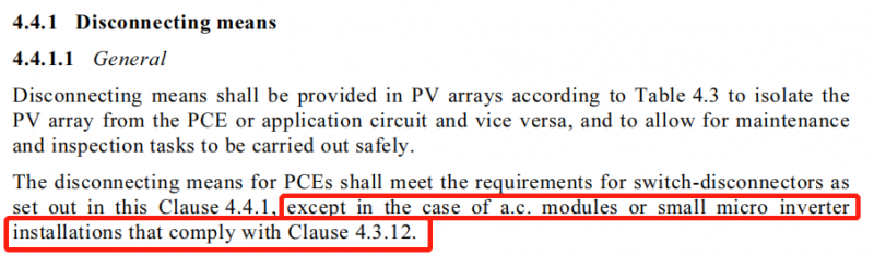根據(jù)AS/NZS 5033:2014標(biāo)準(zhǔn)中提到:對(duì)非交流組件或小型微型逆變器安裝的系統(tǒng)而言,組件和逆變器之間需要安裝斷開裝置;對(duì)交流組件或小型微型逆變器安裝的系統(tǒng)則不需要安裝直流側(cè)斷開裝置。