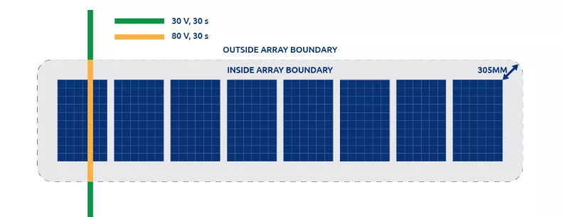 規(guī)范每三年更新一次,在全美范圍內(nèi)有效,但不同的州可執(zhí)行不同版本的規(guī)范。在最新版的NEC2020文件中要求:以距離到光伏矩陣305mm為界限,界限范圍外,在觸發(fā)設(shè)備啟動(dòng)后30S內(nèi),電壓降低到30V以下,界線范圍內(nèi),要求具有“光伏危險(xiǎn)控制系統(tǒng)”,或在觸發(fā)設(shè)備啟動(dòng)后30S內(nèi),將電壓降低到80V以下,也就是要求實(shí)現(xiàn)“組件級(jí)關(guān)斷”。
