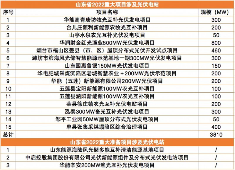 山東本次共下發(fā)449個各類重大項目清單,共涉及15個光伏項目,規(guī)模為3.81GW;并儲備了151個重大準備類項目,涉及3個光伏項目。除此外,還有部分光伏組件、以及光伏電池等生產項目。