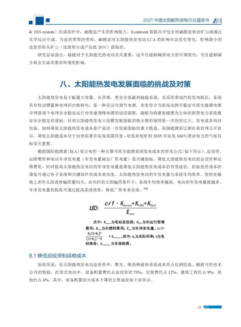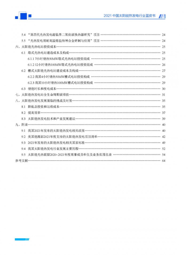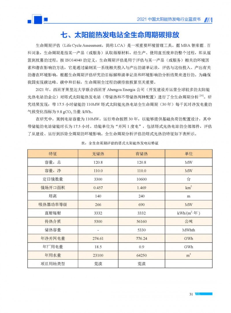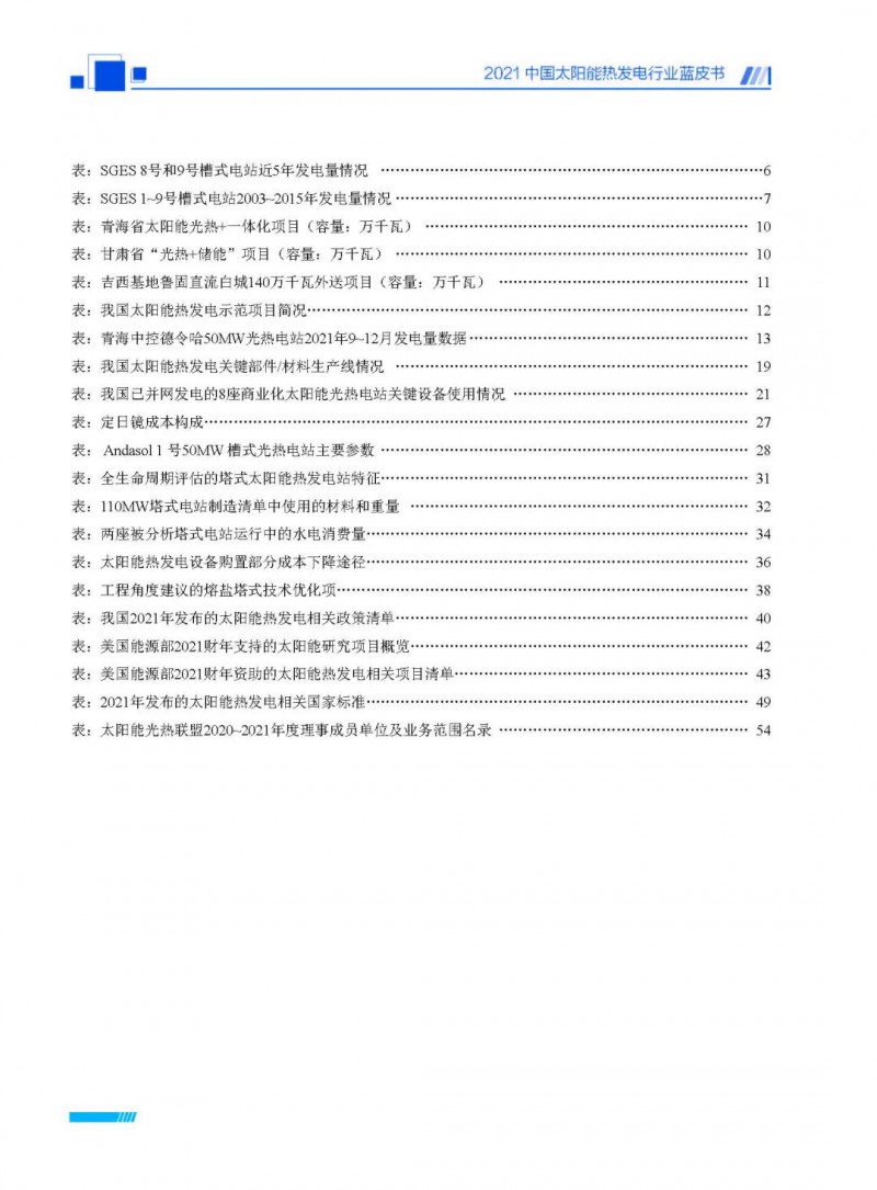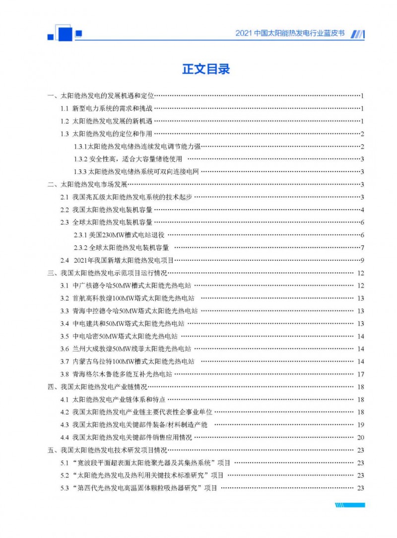 2021中國太陽能熱發(fā)電行業(yè)藍皮書(以下簡稱“藍皮書”)共分為9個章節(jié),分別為:太陽能熱發(fā)電的發(fā)展機遇和定位、太陽能熱發(fā)電市場發(fā)展、我國太陽能熱發(fā)電示范項目運行情況、我國太陽能熱發(fā)電產(chǎn)業(yè)鏈情況、我國太陽能熱發(fā)電研發(fā)項目情況、太陽能熱發(fā)電投資成本、太陽能熱發(fā)電站全生命周期碳排放、太陽能熱發(fā)電發(fā)展面臨的挑戰(zhàn)及對策,以及附錄。附錄主要包括:我國2021年發(fā)布的太陽能熱發(fā)電項目政策、美國能源部2021年度支持的太陽能熱發(fā)電項目清單、2021年發(fā)布的太陽能熱發(fā)電相關(guān)國家標(biāo)準(zhǔn)、我國太陽能熱發(fā)電行業(yè)發(fā)展主要歷程、太陽能光熱聯(lián)盟理事成員單位及業(yè)務(wù)范圍名錄。全文4.5萬+字,共55張圖表。