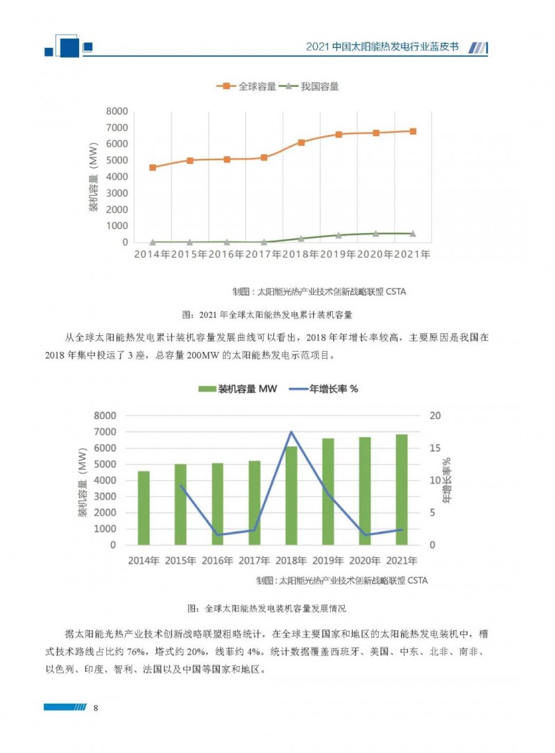 近日,由國家太陽能光熱產(chǎn)業(yè)技術(shù)創(chuàng)新戰(zhàn)略聯(lián)盟、中國可再生能源學(xué)會太陽能熱發(fā)電專業(yè)委員會、中關(guān)村新源太陽能熱利用技術(shù)服務(wù)中心聯(lián)合編制的《2021中國太陽能熱發(fā)電行業(yè)藍皮書》發(fā)布。