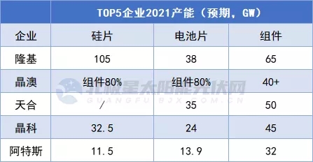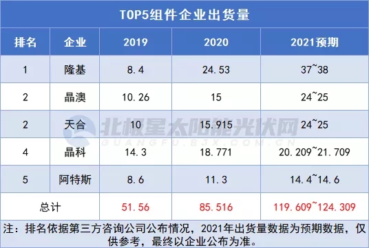 梳理2017年~2021年連續(xù)5年全球組件出貨量排名,TOP5企業(yè)巋然不對,僅排序略有變化。2019年,TOP5企業(yè)即隆基、晶科、天合、晶澳、阿特斯5家企業(yè)組件總出貨量51.56GW,2020年這一數(shù)字增長至85.5GW,而2021年再攀高峰突破120GW。據(jù)BNEF彭博新能源財(cái)經(jīng)預(yù)測,2021年全球光伏新增裝機(jī)或達(dá)183GW。這也意味著TOP5組件企業(yè)的市場占比達(dá)到六成以上。