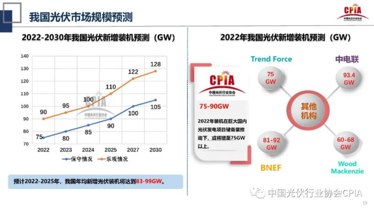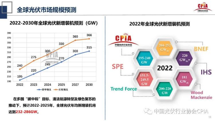昨日由中國光伏行業(yè)協(xié)會組織召開的2021年發(fā)展回顧與2022年形勢展望線上研討會上,名譽(yù)理事長王勃華在報告中對于2022年光伏市場前景給出樂觀預(yù)期,多家機(jī)構(gòu)也給出國內(nèi)新增裝機(jī)75GW以上、全球新增200GW以上的預(yù)測??紤]到光伏電站項目的“組件-逆變器容配比”普遍大于1,全年對光伏組件的需求很可能在250GW以上,其中晶硅組件不少于230GW。