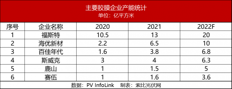 索比光伏網(wǎng)注意到,自 2021年至今,膠膜龍頭企業(yè)陸續(xù)發(fā)布多則擴(kuò)產(chǎn)、投產(chǎn)信息。以百佳年代為例,越南基地一期4GW項目、咸陽基地8GW項目、鹽城基地二期20GW項目以及1月份簽約的滁州基地20GW項目相繼建設(shè)投產(chǎn)。內(nèi)部相關(guān)人士透露,“百佳年代越南基地二期項目正在建設(shè)階段,投產(chǎn)后越南基地產(chǎn)能將達(dá)到16GW,總規(guī)劃產(chǎn)能達(dá)到近100GW。”不久前福斯特、海優(yōu)新材等也表示,其膠膜產(chǎn)能將有數(shù)億平方米規(guī)模的提升,為光伏行業(yè)的快速發(fā)展提前做好準(zhǔn)備。