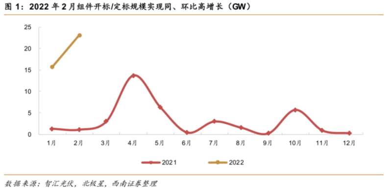 除同比爆發(fā)式增長外,如若著眼于月度間變化,我們認(rèn)為2月需求表現(xiàn)持續(xù)向好。從總量來看,2月開標(biāo)/定標(biāo)規(guī)模達(dá)23.2GW,環(huán)比增長47.3%;從單項目規(guī)模上看,華電集團(tuán)15GW組件集采大單具有較強(qiáng)代表性。