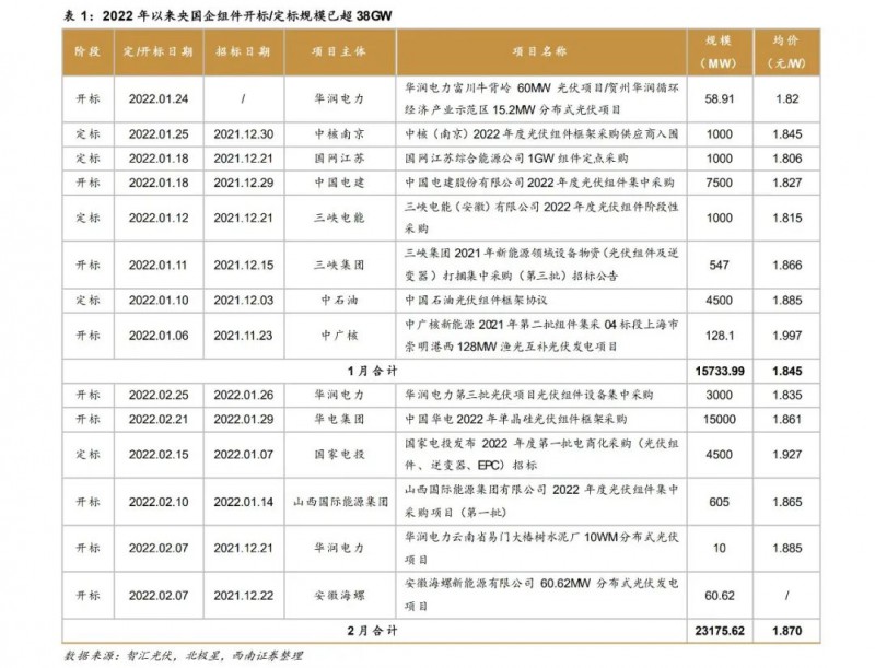 地面電站裝機(jī)需求釋放,央國企組件開標(biāo)熱潮開啟。2021年12月上旬硅片庫存去化、產(chǎn)業(yè)鏈價格回落,地面電站的組件招標(biāo)逐步啟動;疊加部分項目延期、補(bǔ)裝組件等因素,2022開年來終端需求呈現(xiàn)爆發(fā)式增長。根據(jù)我們統(tǒng)計,2022年1-2月,以央國企為主的組件開標(biāo)/定標(biāo)規(guī)模已達(dá)38.9GW??紤]到統(tǒng)計信息的不完全性,實際開標(biāo)/定標(biāo)規(guī)模有望達(dá)到40GW,終端需求表現(xiàn)強(qiáng)勢。