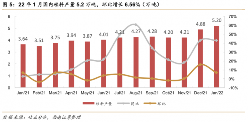 在終端需求的支撐下,產(chǎn)業(yè)鏈各環(huán)節(jié)開工率提升,1月產(chǎn)量創(chuàng)2021年以來歷史新高,帶動原材料需求增長。根據(jù)業(yè)內(nèi)數(shù)據(jù),2022年1月國內(nèi)硅片產(chǎn)量20.6GW,環(huán)比增加15.4%,產(chǎn)量Top5企業(yè)綜合開工率提升至70.45%,環(huán)比增長約2.6pp;電池片產(chǎn)量20.86GW,環(huán)比增長16.99%,主流電池企業(yè)綜合開工率達(dá)76.59%;組件產(chǎn)量19.73GW,環(huán)比增長23.31%,Top5組件企業(yè)綜合開工率68.11%,環(huán)比提升約10pp,也反向印證終端需求向好局面。各環(huán)節(jié)開工率提升直接帶動上游硅料-硅片原材料需求增長。