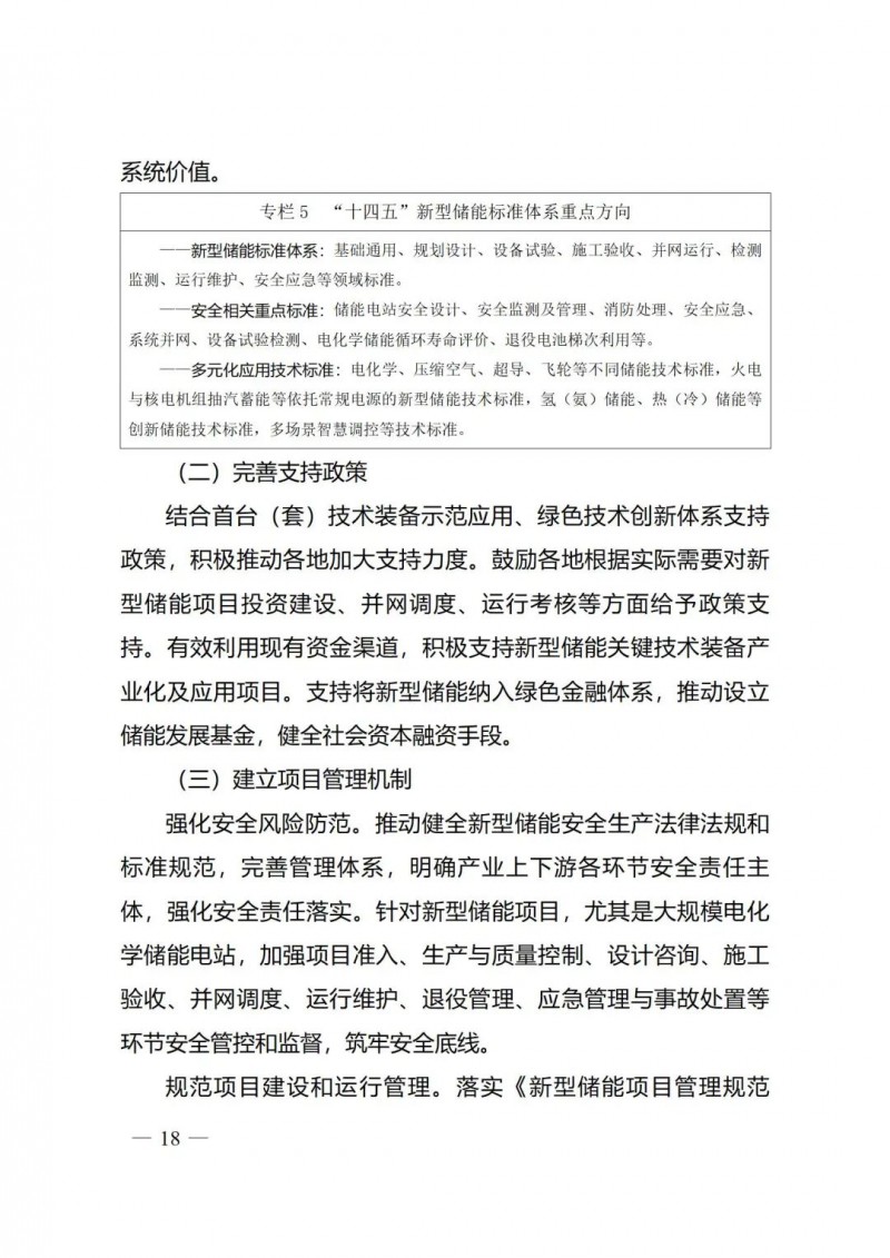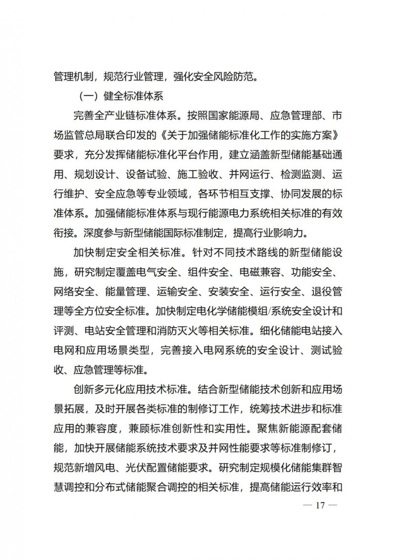 五是著力健全新型儲能管理體系?!秾?shí)施方案》強(qiáng)化標(biāo)準(zhǔn)的規(guī)范引領(lǐng)和安全保障作用,完善新型儲能全產(chǎn)業(yè)鏈標(biāo)準(zhǔn)體系,加快制定安全相關(guān)標(biāo)準(zhǔn),開展多元化應(yīng)用技術(shù)標(biāo)準(zhǔn)制修訂。要求加快建立新型儲能項(xiàng)目管理機(jī)制,規(guī)范行業(yè)管理,強(qiáng)化安全風(fēng)險防范。鼓勵各地加大新型儲能技術(shù)創(chuàng)新和項(xiàng)目建設(shè)支持力度,完善相關(guān)支持政策。加快建立新型儲能項(xiàng)目管理機(jī)制,強(qiáng)化安全風(fēng)險防范,規(guī)范項(xiàng)目建設(shè)和運(yùn)行管理。