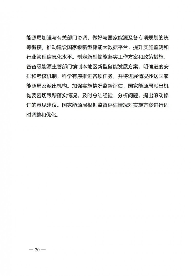 三)保障措施。為保障《實(shí)施方案》有效落地,提出系列具體保障措施。在協(xié)調(diào)保障方面,提出建立包含國家發(fā)展改革委、國家能源局與有關(guān)部門的多部門協(xié)調(diào)機(jī)制,做好與各項(xiàng)規(guī)模統(tǒng)籌銜接;在行業(yè)管理方面,提出建設(shè)國家級新型儲能大數(shù)據(jù)平臺,開展實(shí)施方案各項(xiàng)重點(diǎn)任務(wù)監(jiān)測,提升行業(yè)管理信息化水平;在責(zé)任落實(shí)方面,要求各省級能源主管部門編制新型儲能發(fā)展方案,明確各項(xiàng)任務(wù)進(jìn)度和考核機(jī)制。同時,國家能源局根據(jù)監(jiān)督評估情況,適時對實(shí)施方案進(jìn)行優(yōu)化調(diào)整。