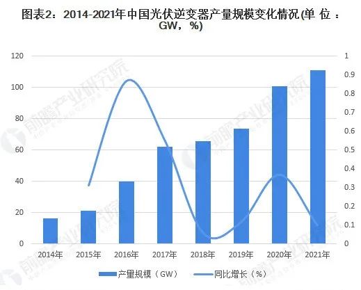 隨著國內(nèi)外光伏發(fā)電行業(yè)的快速發(fā)展,中國光伏逆變器產(chǎn)量由2014年的16.3GW增加至2020年超過100GW,年均復(fù)合增速超過35%。2021年,全國光伏發(fā)電新增裝機(jī)同比增長了10%,國內(nèi)企業(yè)也加大光伏逆變器生產(chǎn)布局,帶動光伏逆變器產(chǎn)量進(jìn)一步增長。
