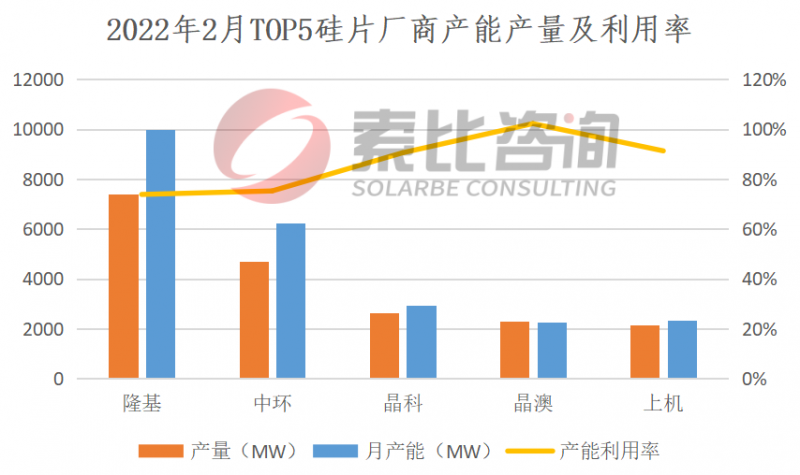 2022年2月,盡管一線企業(yè)開工率提升超過70%,但硅片仍供不應(yīng)求。2022年2月國(guó)內(nèi)硅片產(chǎn)量24.9GW,環(huán)比增長(zhǎng)20.9%。按照產(chǎn)量排名,隆基、中環(huán)、晶科、晶澳、上機(jī)位列前五,企業(yè)總產(chǎn)量19.15GW,占比76.91%,綜合利用率86.6%。預(yù)計(jì)3月份硅片繼續(xù)維持供不應(yīng)求態(tài)勢(shì)。從供應(yīng)端來看,3月份基礎(chǔ)產(chǎn)量已達(dá)上限。從需求端來看,海外需求刺激預(yù)期將延續(xù)至3月底。