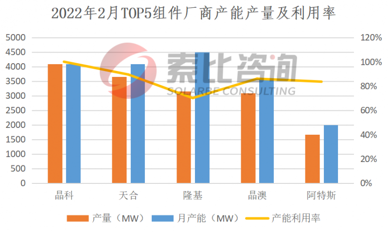 2022年2月,海內(nèi)外市場(chǎng)組件需求旺盛,國(guó)內(nèi)組件產(chǎn)量25.5GW,環(huán)比大增22.63%。一方面,國(guó)內(nèi)部分地面電站項(xiàng)目補(bǔ)裝、央國(guó)企組件開標(biāo)規(guī)模近40GW,一方面,印度即將實(shí)施新的關(guān)稅政策引發(fā)搶裝。按照產(chǎn)量排名,晶科、天合、隆基、晶澳、阿特斯位列前五,企業(yè)總產(chǎn)量15.63GW,占比61.29%,綜合開工率85.75%。預(yù)計(jì)2022年3月,組件需求和排產(chǎn)基本維持2月水平,國(guó)內(nèi)電站補(bǔ)裝及印度搶裝效應(yīng)逐步淡化。