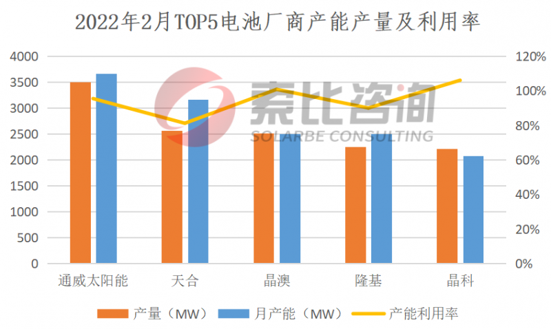 2022年2月,電池企業(yè)產(chǎn)量23.35GW,環(huán)比增長(zhǎng)11.94%。按照產(chǎn)量排名,通威、天合、晶澳、隆基、晶科位列前五,企業(yè)總產(chǎn)量13.05GW,占比55.89%,綜合利用率94.7%。垂直一體化企業(yè)綜合利用率率84.12,主流電池企業(yè)綜合利用率73.96%。