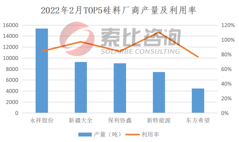 2022年2月,國(guó)內(nèi)13家多晶硅企業(yè)在產(chǎn),大全、永祥、協(xié)鑫、新特?cái)U(kuò)產(chǎn)增量釋放,產(chǎn)量小幅增加。2月份國(guó)內(nèi)多晶硅產(chǎn)量為5.23萬噸(約20.66GW),環(huán)比增長(zhǎng)0.58%。按照產(chǎn)量排名,永祥、大全、協(xié)鑫、新特、東方希望位列前五,企業(yè)總產(chǎn)量4.57萬噸,占比87.4%,綜合利用率90.3%。索比咨詢預(yù)期3月份硅料產(chǎn)量繼續(xù)小幅上漲。從供應(yīng)端來看,國(guó)內(nèi)外終端需求上升,硅片企業(yè)開工率持續(xù)提升,硅料擴(kuò)產(chǎn)釋放亦有增量,預(yù)計(jì)3月份協(xié)鑫、永祥、新特等企業(yè)擴(kuò)產(chǎn)產(chǎn)能仍有釋放增量。從需求端來看,供應(yīng)量增長(zhǎng),價(jià)格有望松動(dòng),進(jìn)一步刺激下游需求。