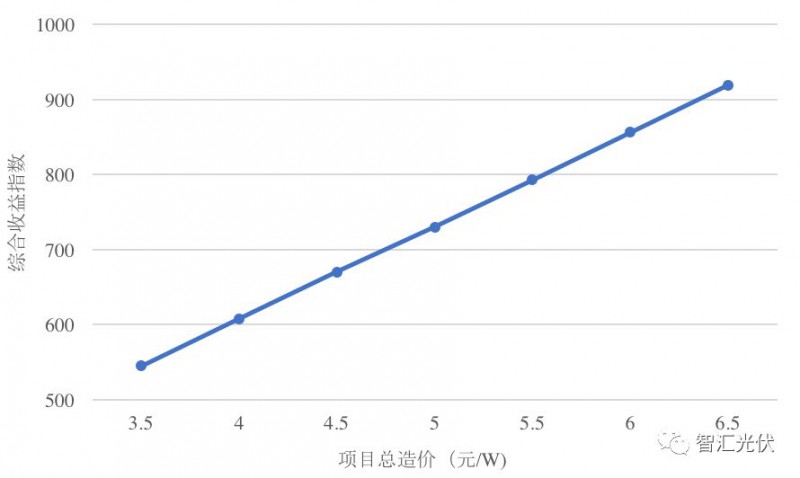 當初始投資為6元/W時,綜合收益指數(shù)(發(fā)電小時數(shù)×上網(wǎng)電價)達到860時,項目內(nèi)部收益率即可達到基準收益率8%;