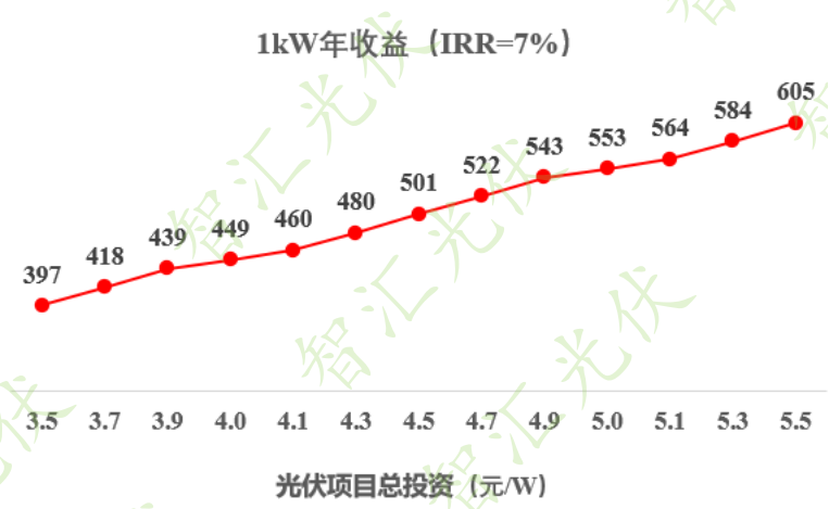 一張圖,解決項目前期開發(fā)人員的問題。如某集團的內(nèi)部收益率標準為7%,可用下圖進行快速判斷。下圖中,橫坐標為:項目的總投資,縱坐標為:1kW年收益(年發(fā)電小時*項目電價)。即“項目總投資”與“1kW年收益”一一對應(yīng),某投資水平下,達到對應(yīng)數(shù)值時,才能達到7%內(nèi)部收益率。