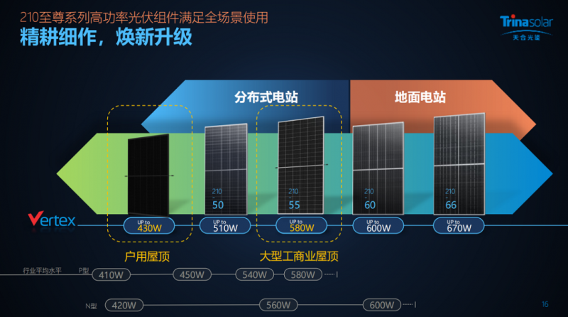 如果說430W組件主要用在戶用光伏,那么,580W組件可以說是海外工商業(yè)分布式項目的優(yōu)秀搭檔。張映斌表示,海外客戶對210大尺寸產品的接受度逐漸提升,部分客戶已經按照182方案搭好支架,但希望改用210高效產品,增加系統(tǒng)裝機容量,他們便適時推出了這款新型組件:寬度與182組件一致(1134mm),長度方向仍采用210電池11片排布,功率最高達580W,比182尺寸的主流功率(545W)提升約6%。