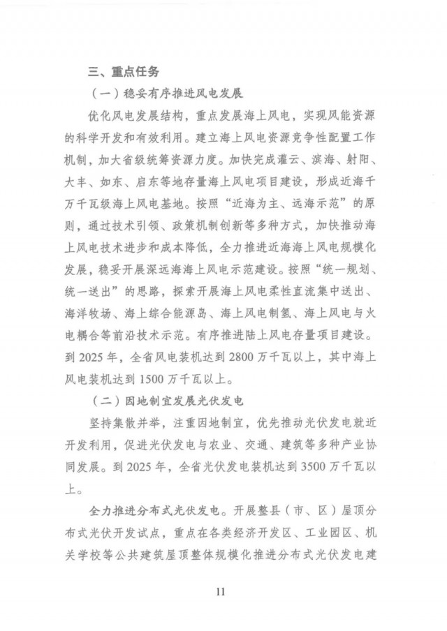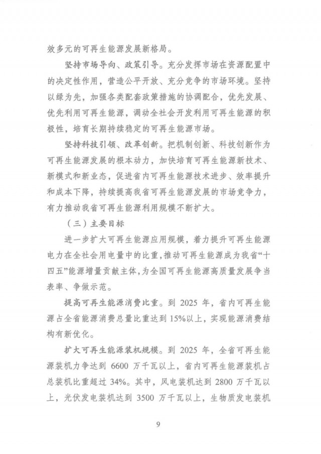 ● 擴大可再生能源裝機規(guī)模:到2025年,全省可再生能源裝機力爭達到6600萬千瓦以上,省內(nèi)可再生能源裝機占總裝機比重超過34%。其中,風電裝機達到2800萬千瓦以 上,光伏發(fā)電裝機達到 3500 萬千瓦以上,生物質(zhì)發(fā)電裝機達到300萬千瓦以上,另外,抽水蓄能裝機達到328萬千瓦 以上,實現(xiàn)電力裝機結(jié)構有新跨越。