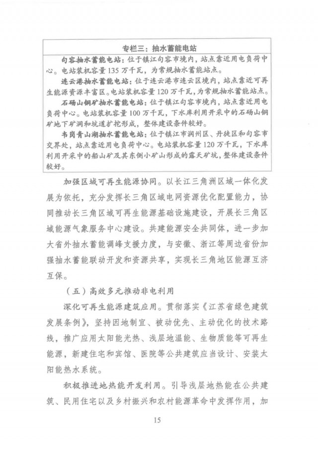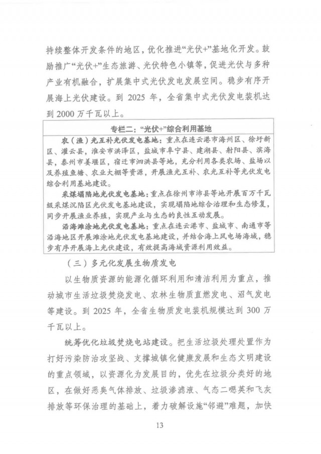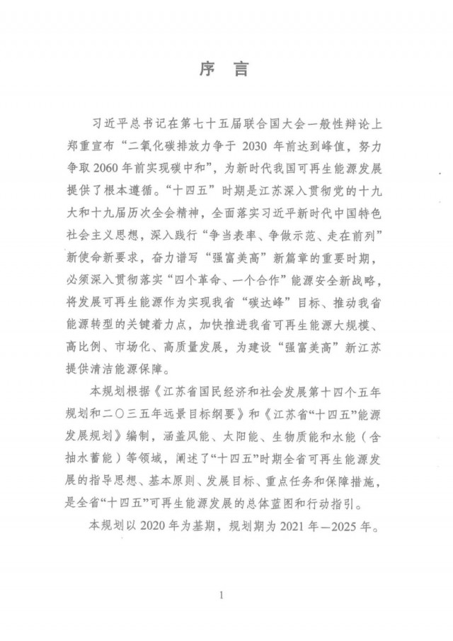 “十四五”期間,江蘇將穩(wěn)妥有序推進風電發(fā)展,優(yōu)化風電發(fā)展結(jié)構,重點發(fā)展海上風電,因地制宜發(fā)展光伏發(fā)電,全力推進分布式光伏發(fā)電,穩(wěn)步有序開展海上光伏建設,加快推進“光伏+”綜合利用,多元化發(fā)展生物質(zhì)發(fā)電,科學推進抽水蓄能開發(fā),高效多元推動非電利用。到2025年,省內(nèi)可再生能源占全省能源消費總量比重將達到15%以上,全省可再生能源裝機達到6600萬千瓦以上,占總裝機比重超過34%。其中,風電裝機達到2800萬千瓦以上,光伏發(fā)電裝機達到3500萬千瓦以上,生物質(zhì)發(fā)電裝機達到300萬千瓦以上。