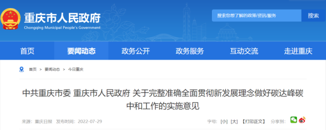 7月29日,中共重慶市委、重慶市人民政府出臺關(guān)于完整準確全面貫徹新發(fā)展理念做好碳達峰碳中和工作的實施意見(以下簡稱“意見”)。